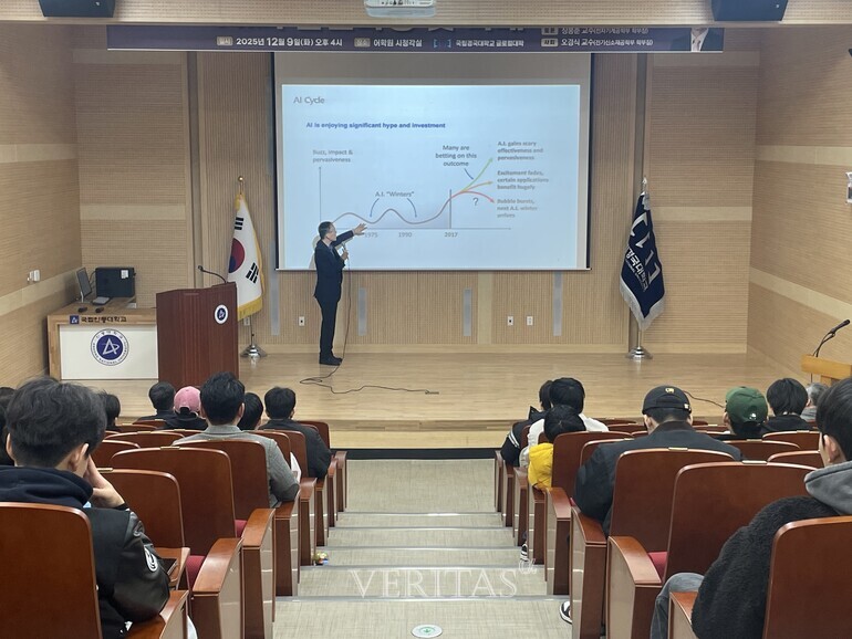 국립경국대(총장 정태주)는 AI의 발전과정 및 미래를 주제로 한 특별강연을 지난 9일 어학원 시청각실에서 개최했다. 이번 강연은 한인구 KAIST 경영대학 명예교수가 초청 강사로 나서며, AI 기술이 산업/경영 분야에 가져올 변화와 미래 지향적 활용 전략을 집중 조명했다. 한 교수는 국내 최초로 AI 기반 지능형 신용평가시스템을 개발한 연구자로, 오랜 기간 인공지능 기술과 경영학을 연결하는 융합연구를 선도해 왔다. 특히 금융, 회계, 기업 의사결정 분야에서 AI의 실질적 적용을 개척하며 대한민국 AI 경영연구의 초석을 다져온 인물로 평가받는다. 이번 강연은 ▲AI 기술의 역사적 발전 과정 ▲딥러닝/생성형 AI의 등장과 산업적 영향 ▲기업 의사결정 과정의 고도화 ▲AI 윤리 및 책임 있는 기술 활용 ▲미래 사회에서의 AI와 인간의 역할 등 다양한 주제가 논의됐다. 강연 후에는 토론자 장봉춘 교수(전자기계공학부 학부장)이 참여해 심층 패널토론을 진행하며, 오경식 교수(전기신소재공학부 학부장)가 사회를 맡아 현장 질의응답과 토론을 이끌었다. 이번 특별강연은 AI 기술의 현재와 미래를 깊이 있게 조망할 수 있는 자리가 됐을 뿐 아니라, 학계/산업계/학생들이 함께 AI 시대의 변화 방향을 고민해 보는 의미 있는 시간이 됐다. Copyright© 베리타스알파무단전재, 재배포 및 이용(AI학습 포함) 금지